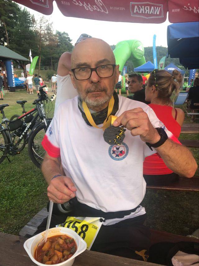 Ostatnie 3 km to zapadające ciemności (wysoki las) a ja… zdwoiłem czujność i zdecydowanie zwolniłem – po prostu obawiałem się korzeni których nie widziałem dobrze… Drewniane mostki, schodki z bali, podbiegi, zbiegi, w oddali przebłyskująca ściana światła – wypadłem na łąkę… jeszcze kilkaset metrów i asfaltowy zbieg do mety.