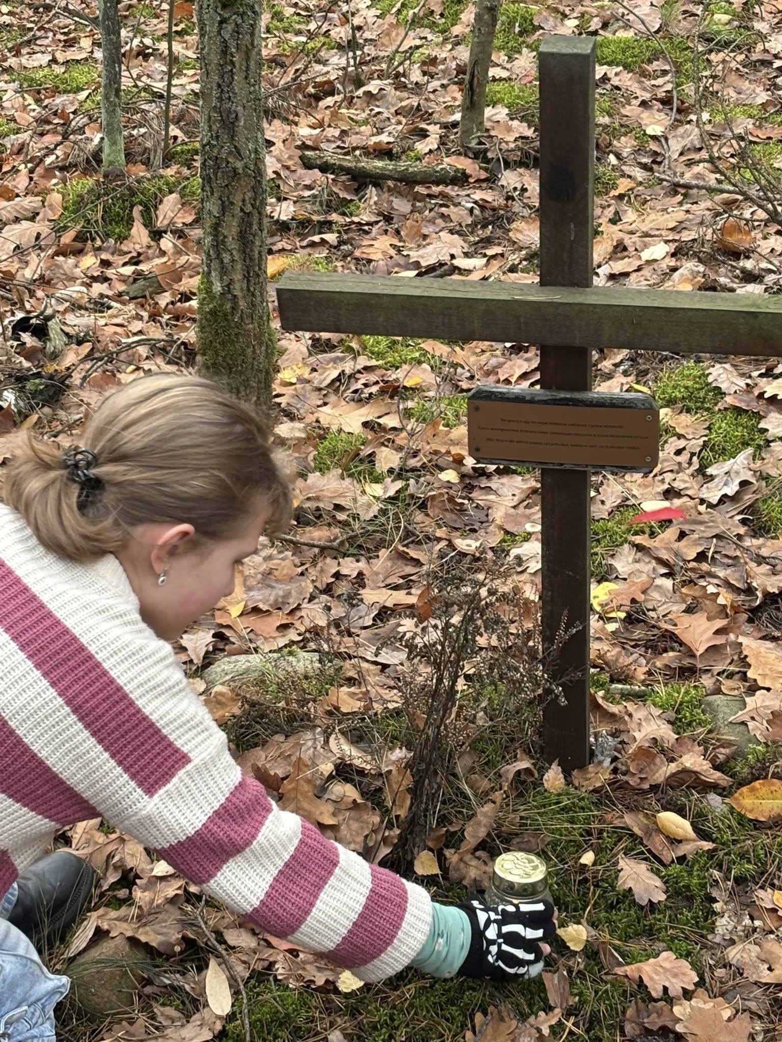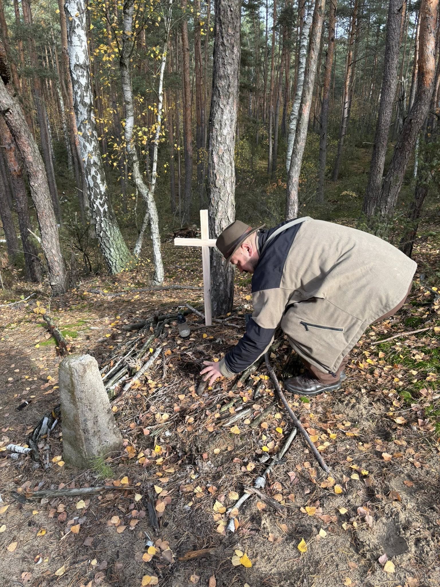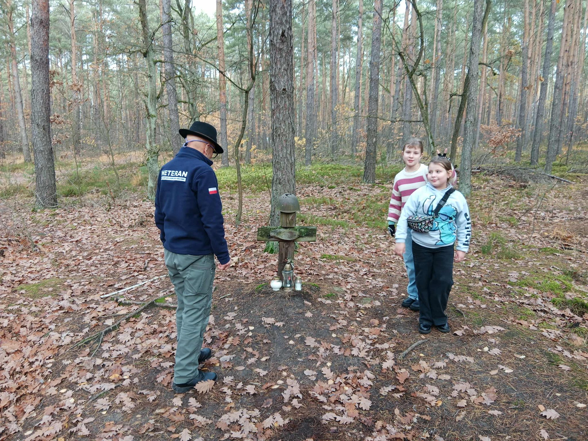 Dwa zaniedbane groby / ich pozostałości wymagały wymiany krzyży. Na pozostałych – „otulonych jesienią” paliły się znicze – zapaliliśmy też nasze. Myślałem o walkach w tym lesie… ilu poległych nie odkryto ? Dowiedziałem się od Pana Adama o historii „trupiej górki”, której tu szukałem. Chodziłem po niej, tutaj biegam. Po wojnie odkryto na niej 30 poległych żołnierzy rosyjskich, ledwie przysypanych piaskiem.