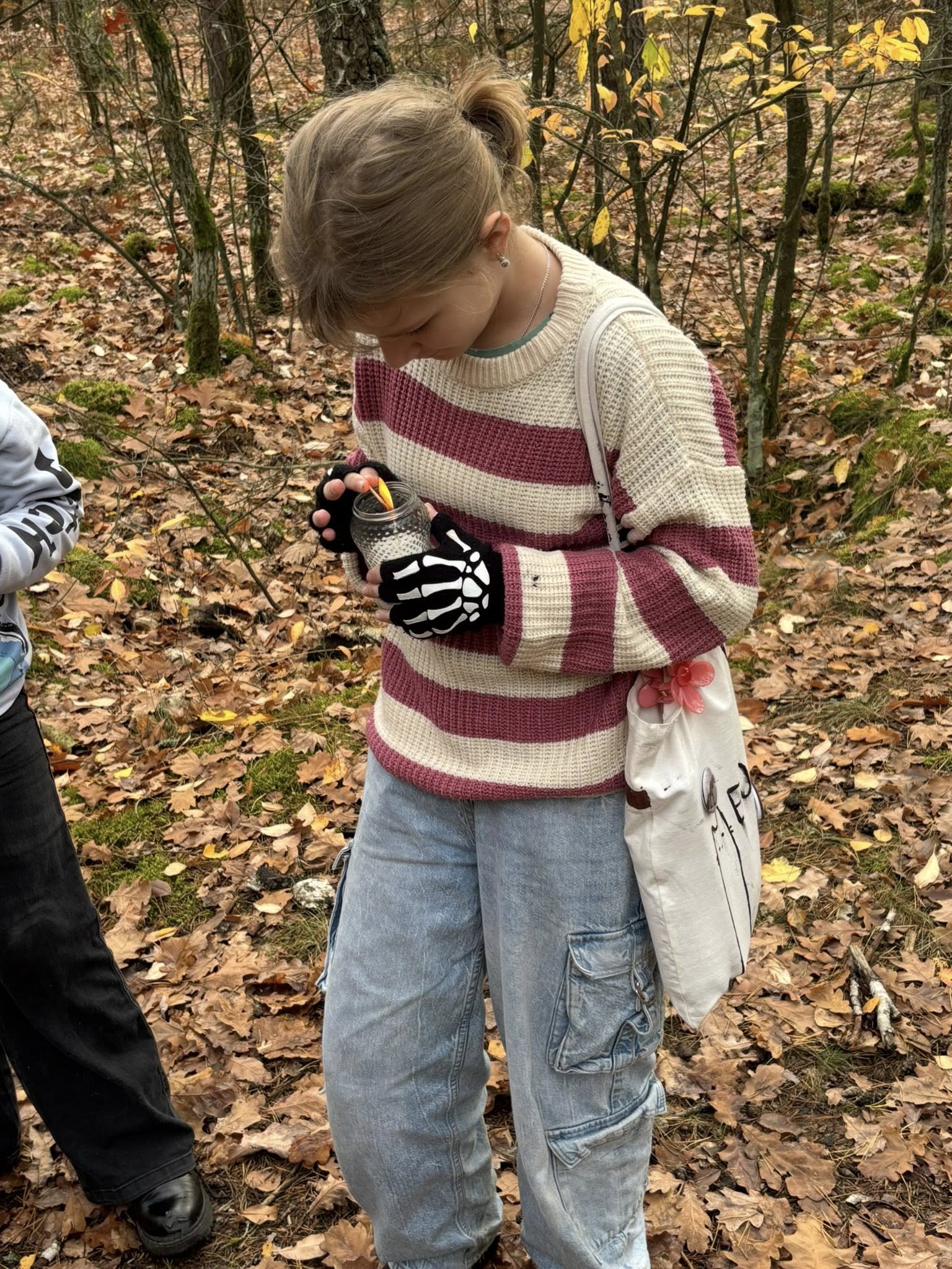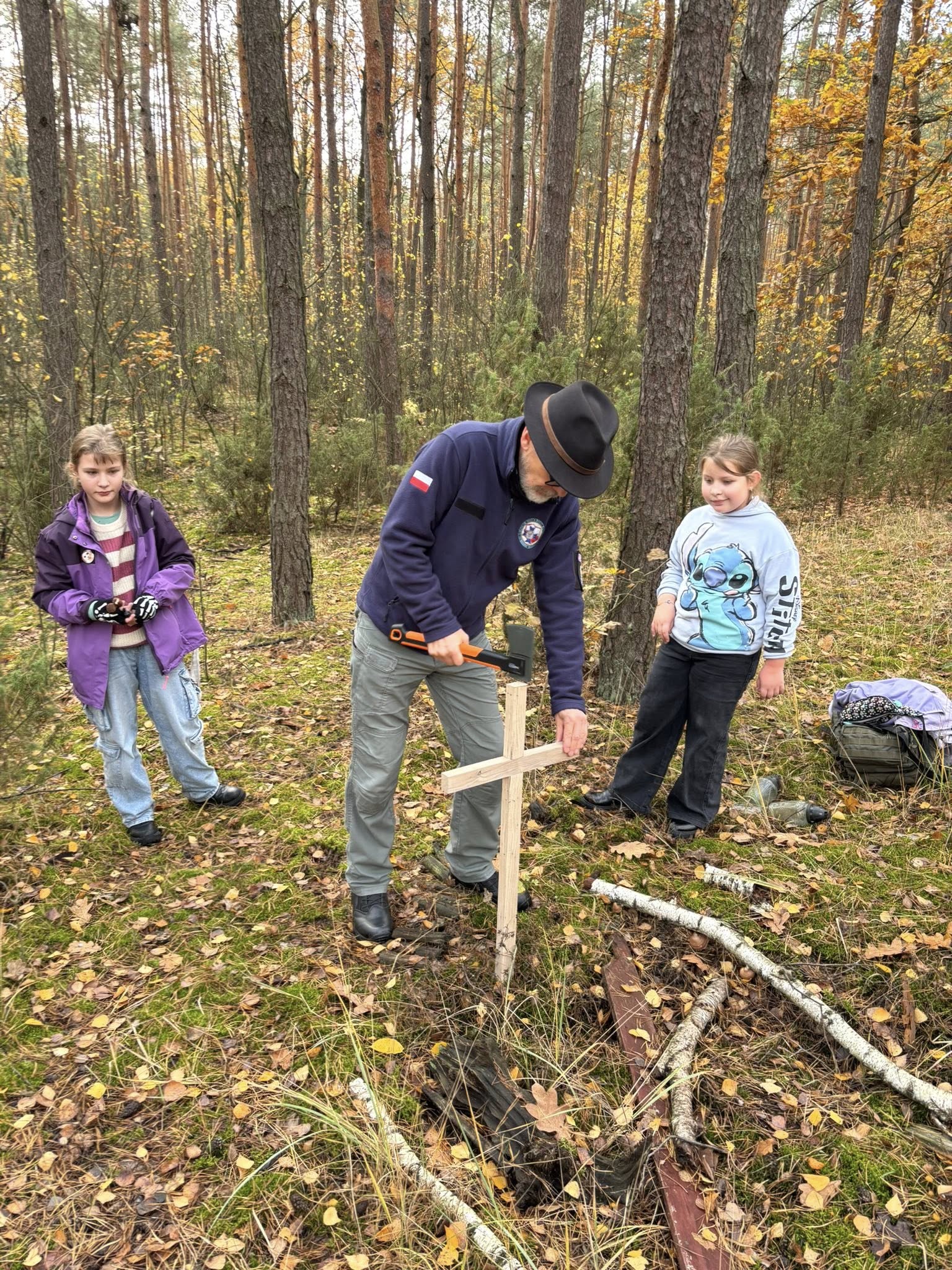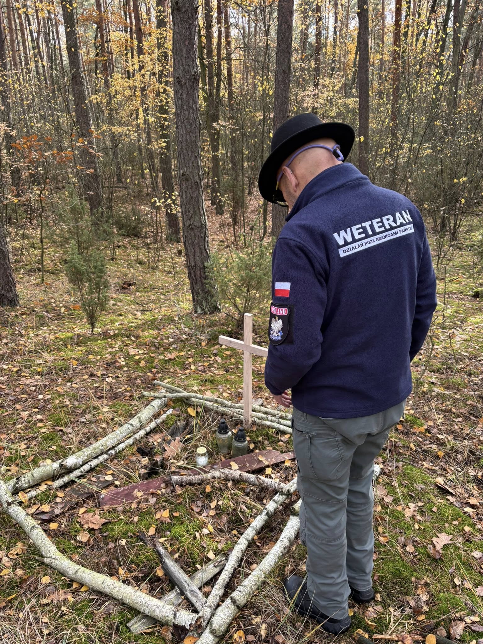 Dwa zaniedbane groby / ich pozostałości wymagały wymiany krzyży. Na pozostałych – „otulonych jesienią” paliły się znicze – zapaliliśmy też nasze. Myślałem o walkach w tym lesie… ilu poległych nie odkryto ? Dowiedziałem się od Pana Adama o historii „trupiej górki”, której tu szukałem. Chodziłem po niej, tutaj biegam. Po wojnie odkryto na niej 30 poległych żołnierzy rosyjskich, ledwie przysypanych piaskiem.